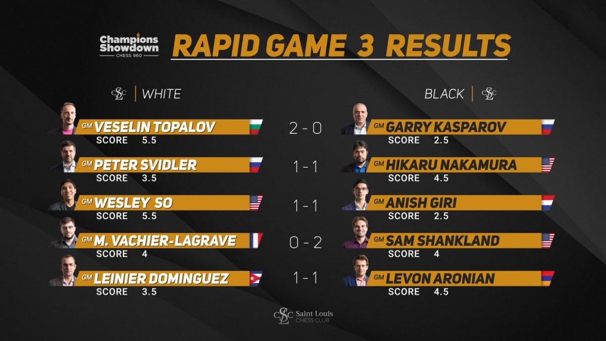 4 days of rapid and blitz using different Chess960 start positions. Final combined scores (rapid points worth double the blitz points): Topalov 14.5-11.5 Kasparov, Nakamura 14-12 Svider, So 15.5-10.5 Giri, MVL 17.5-8.5 Shankland, Aronian 17.5-8.5 Dominguez.
