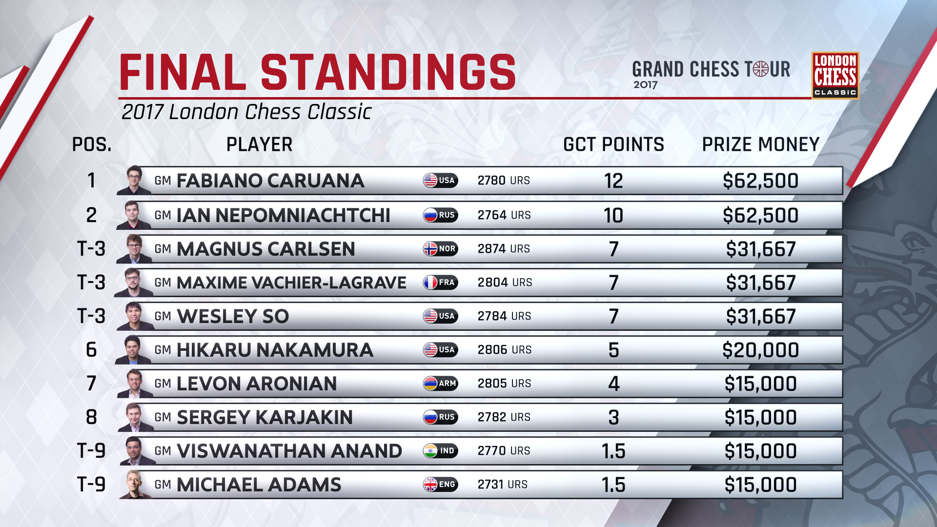 Fabiano Caruana won the event after a rapid, then blitz tie-break again Ian Nepomniachtchi. Magnus Carlsen won the whole Grand Chess Tour series after beating Levon Aronian from an almost busted position. Carlsen was scathing in his criticism of his own play in London but also clearly had a bad cold.